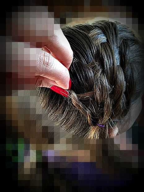 Al acercarse a la cola de caballo de lado izquierdo, asegúrese de dejar la venda de elástico en su lugar y continuar trenzar la cola de caballo.