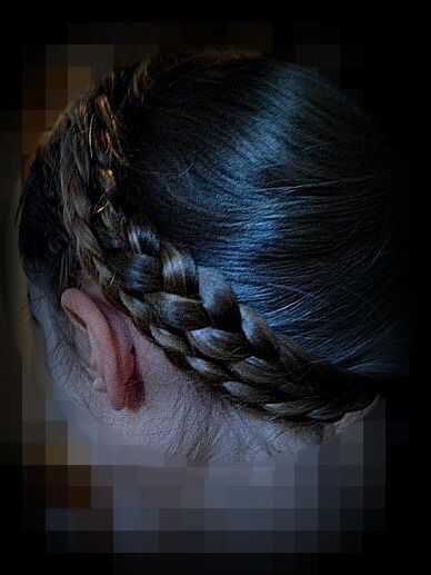 Envolver las trenzas hacia el centro de la parte superior (corona) y fijar con horquillas.