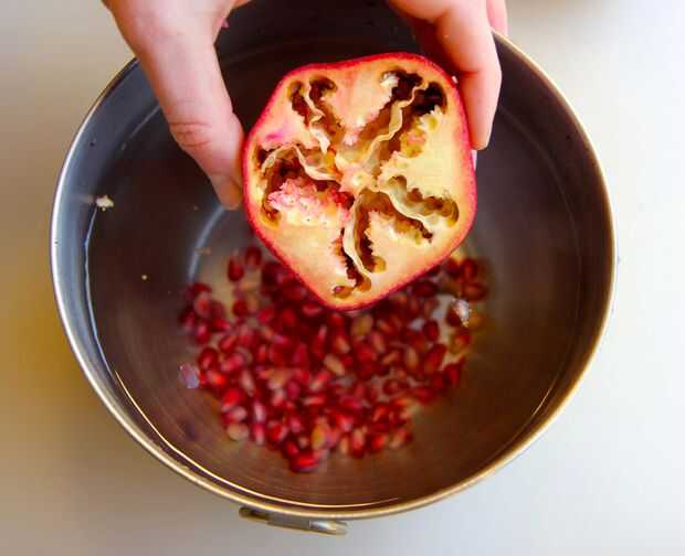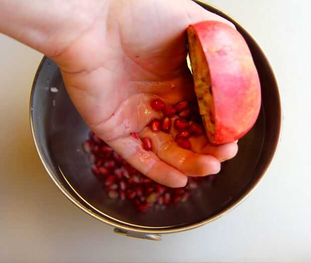 El agua permite que las semillas buenas se hunden hasta el fondo del tazón de fuente y obtener lavados. Flotadores de la membrana de Granada. Si tienes semillas adheridas a trozos de membrana, escoger y debe hundirse hasta el fondo, dejando sólo la flotación de la membrana.