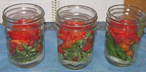 Añadir 1/3 de los pequeños tomates Cherry a cada frasco, luego 1/3 de los tomates Cherry y uva en cuartos y luego añadir el último 1/3 de los tomates en rodajas de Roma.