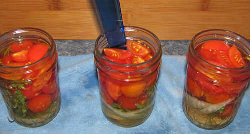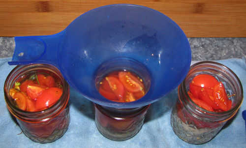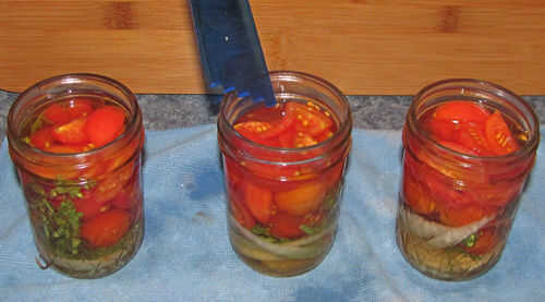 Este lote hace tarros de masón de 3 x 8 oz de tomates en vinagre.