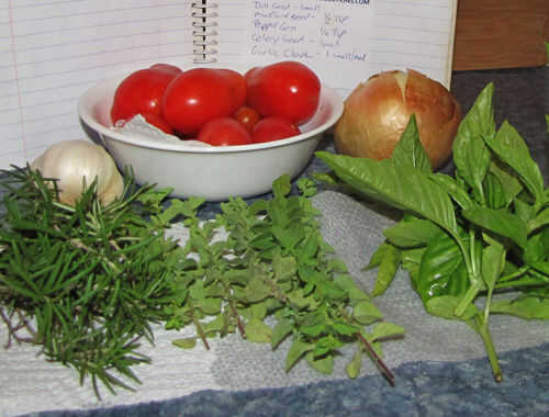Agregue lo siguiente a los tarros preparados, en este orden. Primer lugar una ronda de cebolla en el fondo de cada frasco, luego cae en 1 diente de ajo y finalmente doble e inserte el Romero, la albahaca y el orégano.