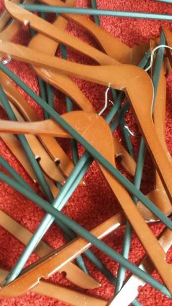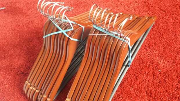 Cuidadosamente apilar un montón de la suspensiones. Una banda de goma alrededor de los ganchos del lazo, el abrigo bajo la hipotenusa de las perchas y lazo sobre uno o más de los ganchos.