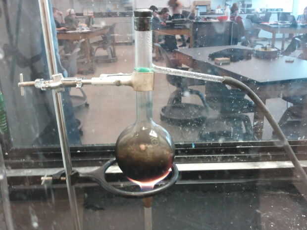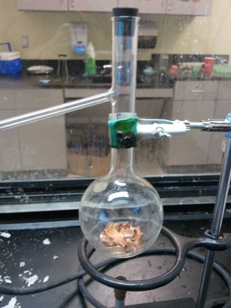 1.) sistema matraz fondo redondo en el stand. Tienen un tapón de goma en la parte superior que tiene dos agujeros. Uno tiene el tubo del thistle en él, el otro tiene un tubo que lleva a su punto de recogida. Los turnings de cobre están dentro de este frasco.