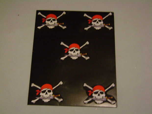 Éstos fueron aún más fáciles de hacer que el cuaderno de Sixxkiller porque no tengo que lidiar con la lámina de plástico. Simplemente corte las calaveras pirata con tijeras teniendo cuidado de no cortar a través de piezas y encolar cada pieza en la cubierta con un palillo de pegamento. Hice lo mismo para el cuaderno y carpeta.