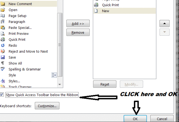 Comprobar el "Mostrar acceso rápido barra de herramientas abajo la cinta" y haga clic en Aceptar.