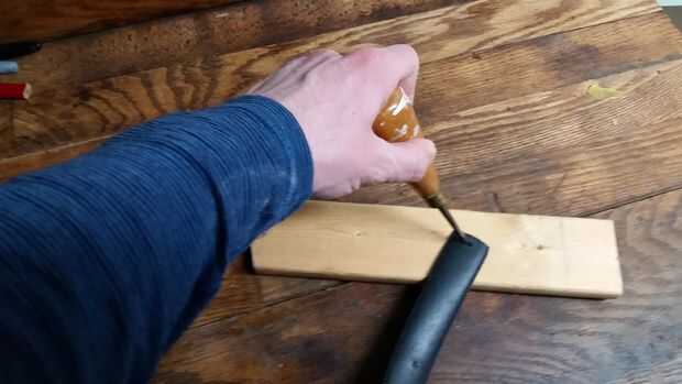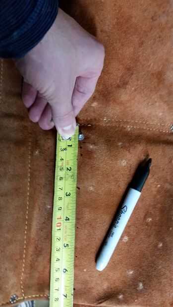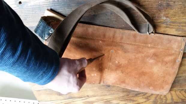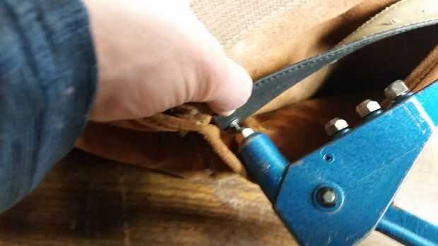 Me pareció útil para marcar con un lápiz o un marcador donde iría mi agujeros. Luego usé un punzón para perforar los agujeros para los remaches. Empujando contra un trozo de madera fue de ayuda. A continuación monté remache con una placa de soporte y pistola de remache.