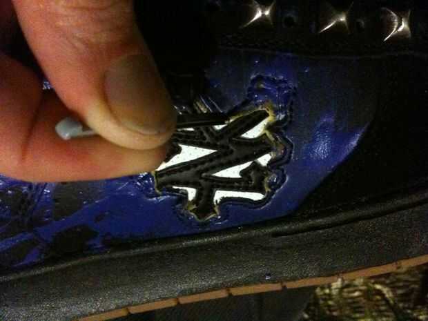 Asegúrese de que la pintura haya curado antes de quitar la máscara. La pintura se verá brillante si su mojado. Las salpicaduras y gotas toman más tiempo para secar. Deshacerse de todo el tejido que viene con el zapato, porque la pintura salta de él y hace un lío. Retire la cinta adhesiva del zapato y desechar. Sacar unas pinzas y a recoger el líquido de enmascarar alrededor del emblema. Descarga el exceso de pintura de la tapa y rellene con disolvente de pintura. Limpie el gotero y el cepillo de arte, luego limpie la tapa y poner en la lata.