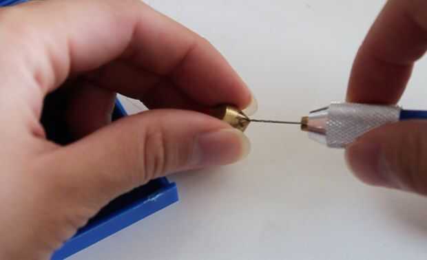 Montar la broca en el taladro de mano. Alinee la broca con el orificio en la boquilla. Aplicar un poco de presión y girar el taladro de mano hasta que pasa a través. Es bastante fácil, puesto que ya hay un agujero de entrada.