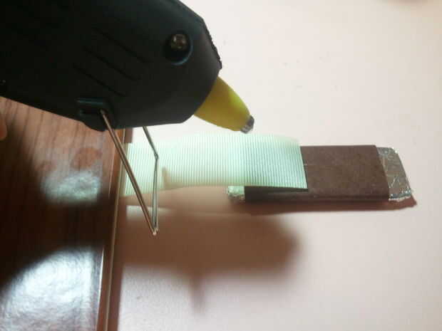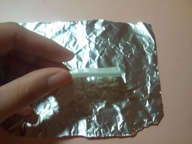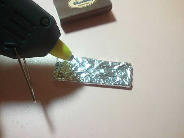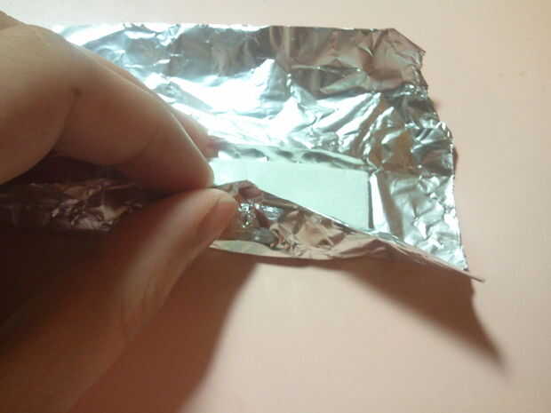 Cortar dos trozos iguales de cinta de espuma polivinílica y ponerlos juntos. Poner en el papel de estaño. Envuélvalo para arriba y pegar con un papel de embalaje. El falso chocolate bar sobre la cinta del pegamento. Pegue la cinta mágica en el libro de programa y la cinta.