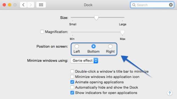 • Mover hacia abajo y elija donde desea ubicar la base: derecha, izquierda, o hacia abajo. Aquí usted puede también elegir una opción "ocultar automáticamente y mostrar el Dock, simplemente marca el espacio en blanco a la derecha.