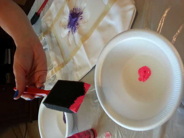 Ahora vierta tamaños dos cuarto de la segunda pintura de tela en un recipiente. Un poco va un largo camino que vierta más como sea necesario.