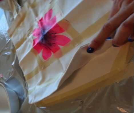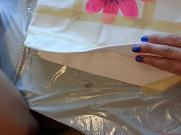 Para evitar los no deseados de las áreas de pintura, voltear la solapa inferior como se ve arriba. Luego, con cinta las esquinas exteriores y parte inferior de la aleta que está tocando la mesa.