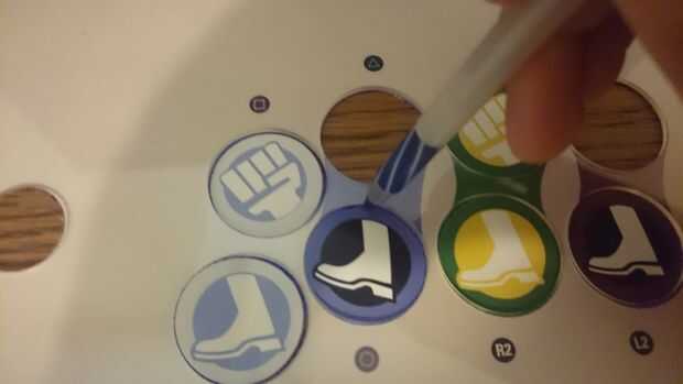 - Utilizar una cuchilla Xacto o presione fuertemente con un bolígrafo para cortar los agujeros del botón y joystick.