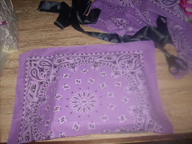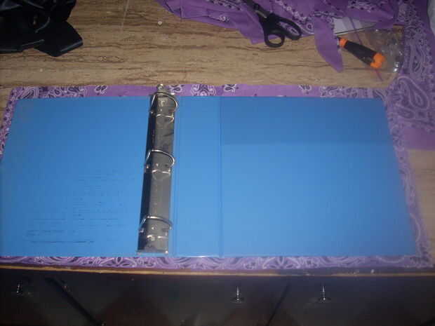 Primero quiere pone el bandana en la parte delantera de la máquina. Recorte el exceso dejando aproximadamente 2 pulgadas en todos los lados. Pegar el bandana a la cara de la parte exterior de la cubierta frontal. Luego hacer lo mismo para la parte trasera exterior. Luego abrir la carpeta y plegar los bordes y pegar en el interior cubiertas.