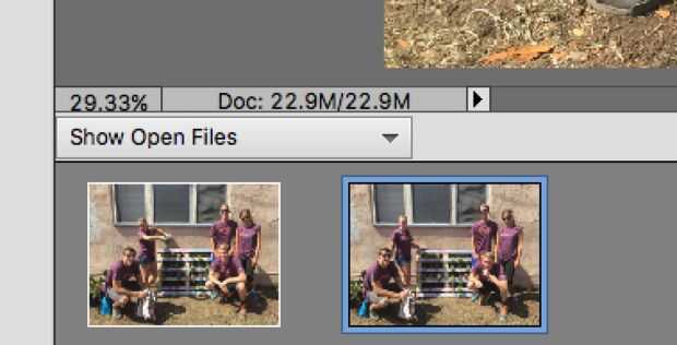 En la parte inferior de la ventana de Photoshop, verá los dos archivos que tengamos abiertas. Mantiene pulsado comando, haga clic en dos de las imágenes. Esto los dos selecciona y nos permiten combinarlos.