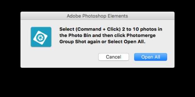 Esto abrirá una nueva pantalla que se iniciará el Photomerge. Recibirá un mensaje emergente que le pide que seleccione las fotos, puede seleccionar abrir todos.