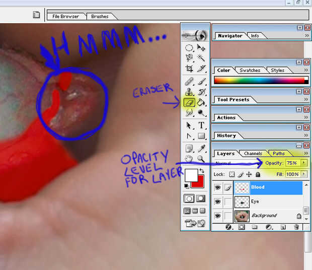 También vi cuando fui ampliada en que la parte rosa del ojo era meter más el dedo índice. Voy a borrar que también así que eso él se parece a su interior la cavidad están formando los dedos. Etiquetaron HMMMM con un círculo azul grande. I seleccione la capa del ojo y bajar la opacidad y borrar al igual que la sangre. Otra vez, esto es una preferencia personal.