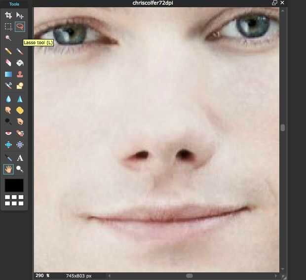 Utilizar la herramienta lazo para tomar más piel coloreada parte de la nariz hacia fuera (sólo paciencia, sé no tiene sentido)