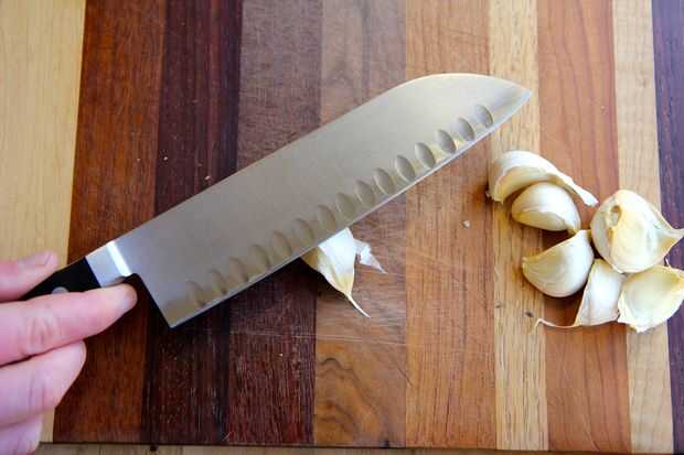1. Coloque el lado plano de su cocina o cocineros cuchillo encima de un solo diente sujetando el mango del cuchillo.