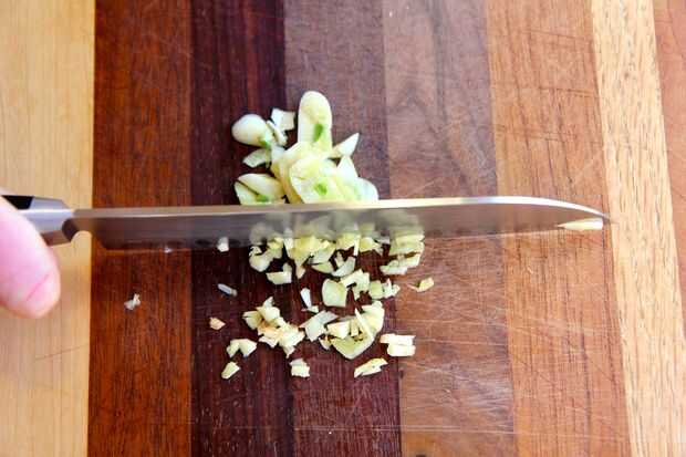 3. una vez que haya realizado a través de su pila de ajo, deben tener uniforme pedazos de ajo picado. Si no son para el tamaño que desea, puede continuar cortando hasta obtener que el tamaño.