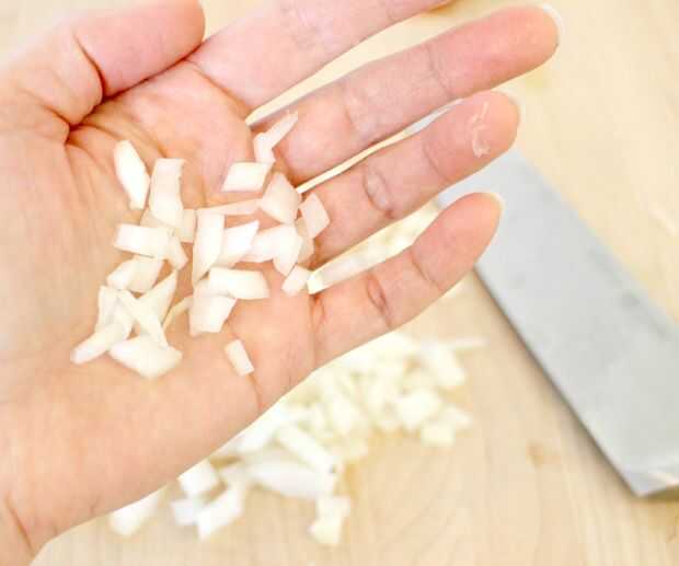 Convertir lo que queda de su parte poco y corte hasta que estés cerca de la raíz. Pedazo de final poco pasado junto con la punta superior de la composta. Y ya está! Cebollas finamente picadas sin derramamiento de sangre ni lágrimas. Una victoria importante de la cocina!!!