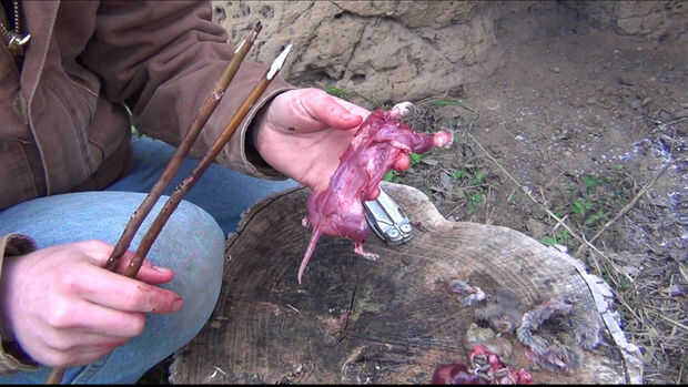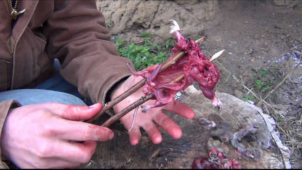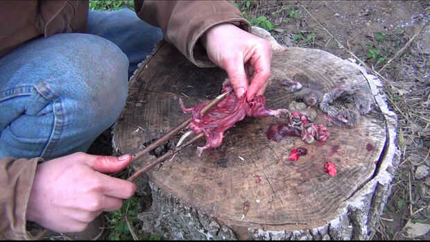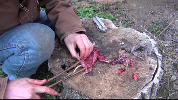 Una vez que la carne ha sido lavada, es tiempo para prepararse para el fuego. Hay muchos tipos de saliva que puede utilizarse para cocinar sobre un fuego, de este Instructable he incorporado un asador dos aspectos. Independientemente del diseño de asador, todo debe hacerse de las ramas de vida joven (espadas de madera muerta que incendiarse causando a perder su comida). El espetón es afilado y empujado a través de las porciones más grandes/más gruesas de la gopher para asegurarse de que no se caiga durante el proceso de cocción. Observe que las horquillas son también mantener el cuerpo ubicado para aumentar la superficie, asegurando así incluso y completar la cocción de la carne.
