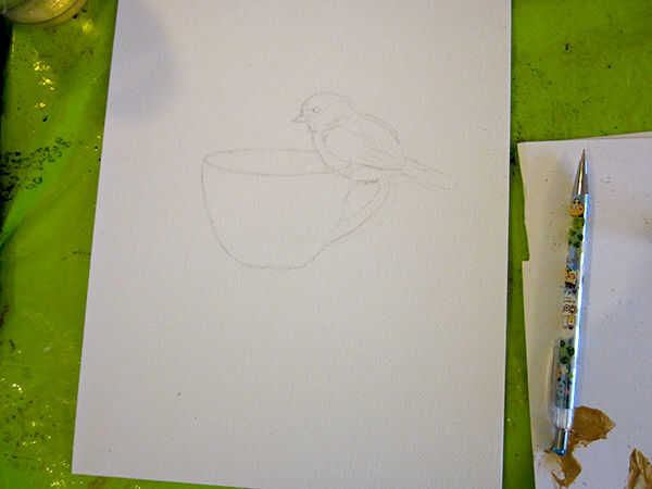 Bosquejo el ave con un lápiz. En este punto usted puede hacer cambios para que no tenga miedo de usar la goma! Es importante que las líneas finas de su pájaro.