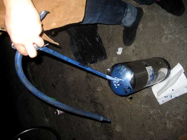 Ahora, rociar el jugo de funky de dentro el extintor. Asegúrese de que esté vacío y de presión antes de apertura. Abrir con una llave grande.