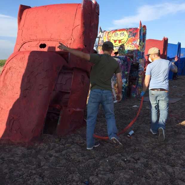 Con muy poco aviso y orina mala planificación decidimos que sería 9 horas a Cadillac Ranch y pintar la cosa entera... Entonces Descargue un montón de fuegos artificiales detrás de él!