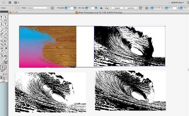 Podría tomar varios intentos con el calco y pintura interactiva herramientas para obtener la configuración exactamente correcto. Experimenté con colocar la imagen sobre un fondo de madera, que fue útil para visualizar lo que puede parecer una vez que las imágenes es colocado en la madera. Se puede ver cómo el ejemplo superior izquierdo carece de gran parte de la onda de rotura, por lo que ajustar la configuración para más detalles de la onda a expensas de un poco más ruido en la imagen.