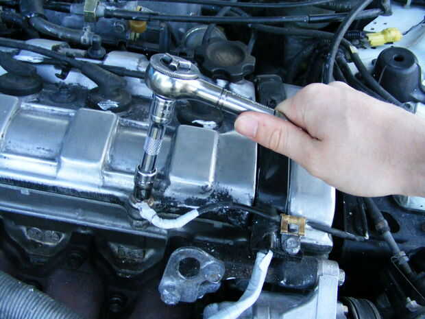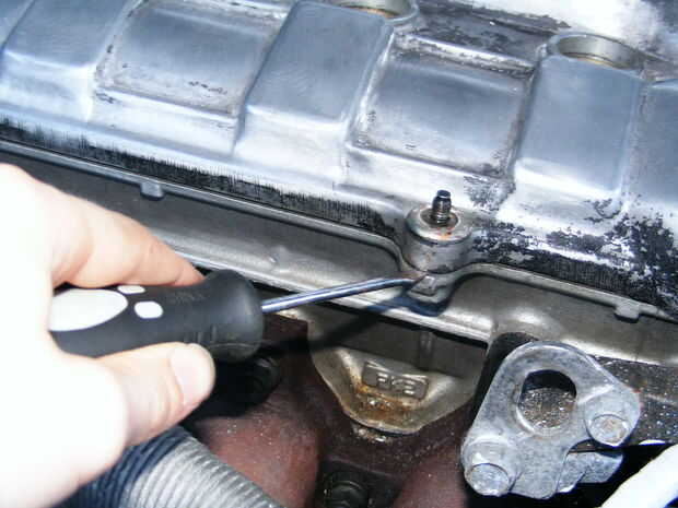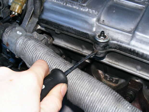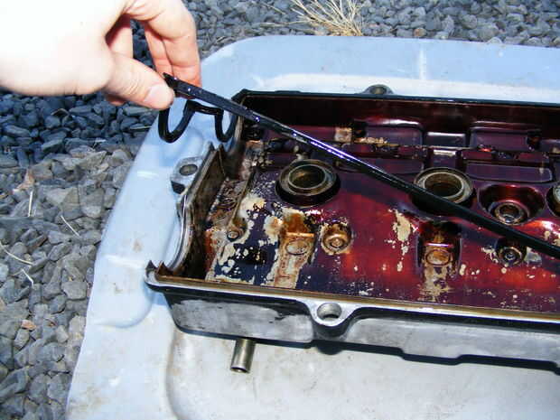Ahora usted tendrá que quitar la válvula de tapar un poco. Para mi coche, tuve que usar un destornillador de cabeza plana para quitar la tapa de la válvula para arriba y romper el sello de la Junta. Ahora, mi coche tiene una Junta de goma, para no tener que preocuparse mucho acerca de lo ripeo. Es posible que tenga una Junta de goma no, y si lo haces, tienes que sacar otro para sustituir a la que estás probablemente de ripear. Ahora, utilizando el destornillador de cabeza plana, haga palanca en la tapa de la válvula hacia arriba en el lado del conductor. Entonces el lado del pasajero. No importa qué lado empezar en. Puede que necesite apalancar en la parte posterior, pero no lo hice.