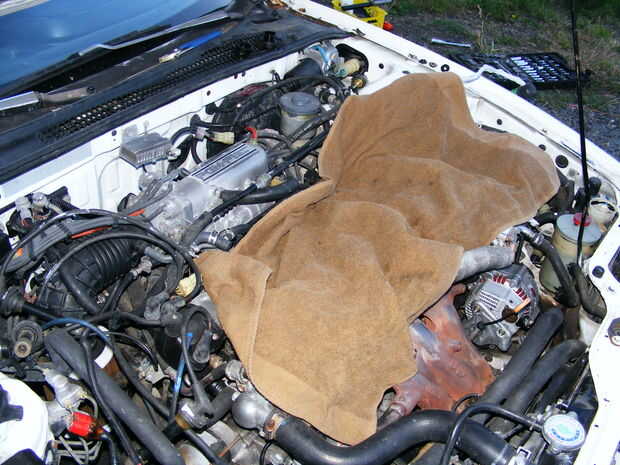 Probablemente deberás mover la cubierta de la válvula mucho que bajar. Una vez que has quitado la tapa de la válvula, coloque sobre una superficie limpia dura, utilicé una tapa de tina para la limpieza y un trozo de fibra de madera para la pintura. Cubrir la tapa de la válvula con la toalla, para que no pasar polvo se mete en él, o partículas de pintura. Es crucial tener una toalla para este trabajo.