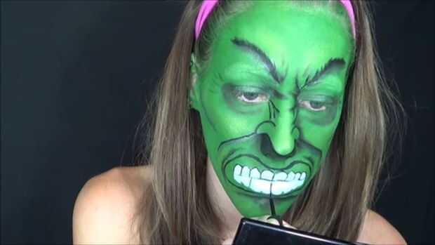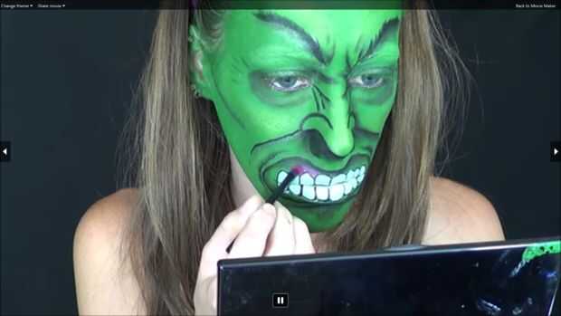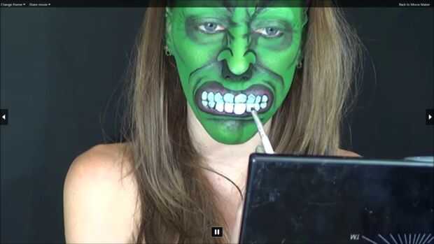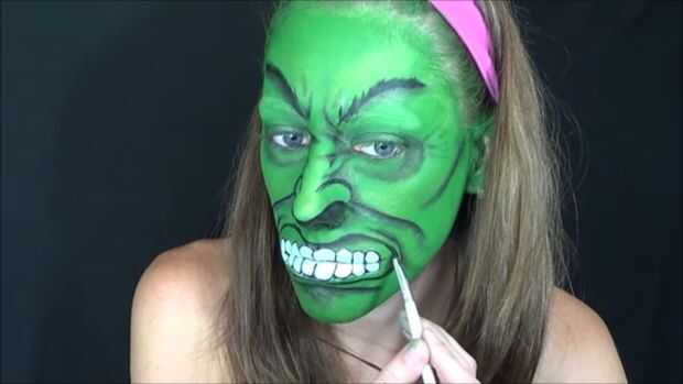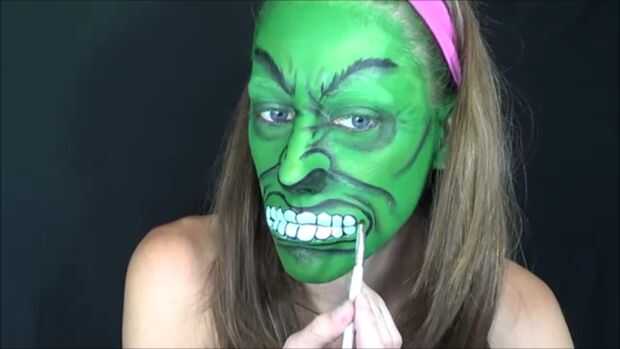 Utilizar un delineador líquido para hacer las líneas en los dientes y luego usar esa sombra de ojos negra para agregar sombra en el interior de la boca y luego tomar una pintura de cuerpo rosado de mi paleta metálica de Mehron llené en las encías.