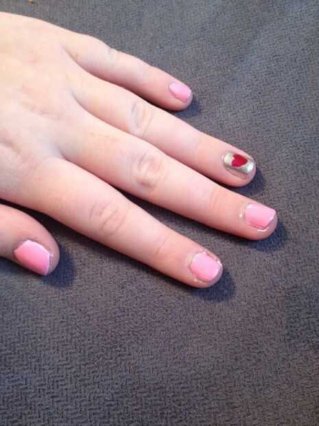 Para acabar con las uñas agregar un lindo corazoncito con el más oscuro de tus dos colores opta por su dedo anular. Luego agregar una capa superior y deje que se seque.