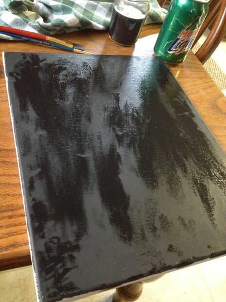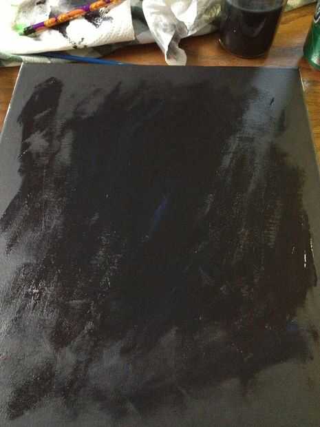 Pintar la lona negra lisa con el cepillo plano. Esto establece el vacío detrás de lo que será pintado. Este negro no tiene que secar hasta después de agregar azul (así mezcla mejor) luego mezclar el azul con negro (sobre mitad y mitad) para hacer un color azul marino muy oscuro. Pintar un irregular redonda con forma de gota grande que el lienzo, pero con un margen de pulgada. El azul será apenas visible. Dejar secar antes del siguiente paso.