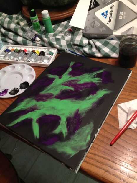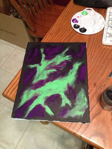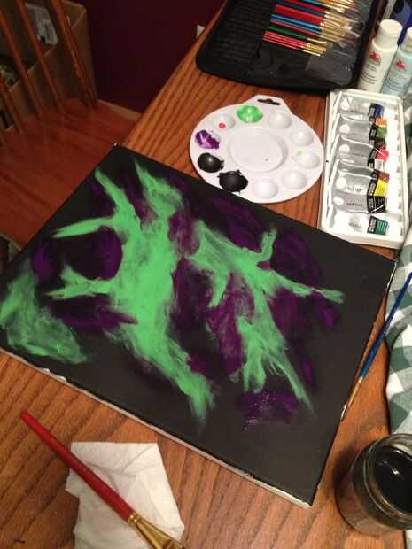 Ahora cuando se ha secado el color principal, borrón de transferencia algunas pequeñas cantidades de púrpura cerca de los bordes del verde y a veces solapado. Esto le da ese tono morado que se cierne alrededor de las nebulosas. No manchar demasiado pero sobre un medio de tamaño cantidad de botón de púrpura a borrón de transferencia.