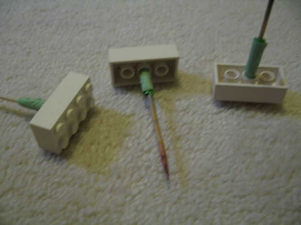 Fije las piezas a los palillos de dientes (que rodé cinta alrededor de la tootchpicks por lo que encajaría en el agujero de la pieza de lego)