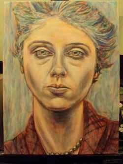La profundidad del pintar sigue siendo evidente, pero el exceso de naranja y blanco ha hecho colores de pintar a hundirse en la más profunda lo que los hace mucho más sutil. El retrato final no debe ser una copia de la foto de la fuente, pero debe ser una expresión de la emoción, la forma que desee el retrato a sentir. Creo que tengo bastante cerca sus dimensiones reales, sin embargo, la pintura aparece muy diferente a la foto de la fuente. El juego en color y la luz me permitió acentuar la sensualidad de sus ricas características faciales. Siempre pinto estilo libre, sin nada como rejillas para intentar copiar las dimensiones. Esto es sólo mi preferencia personal.