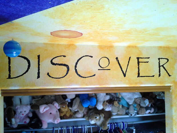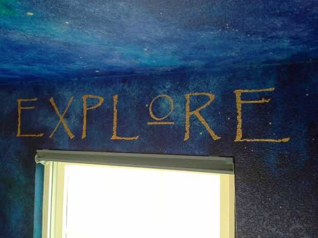 Imprimir tus palabras o letras mediante una impresora de computadora sobre papel de copia normal. Imprimir grandes lo suficiente como para que pueda obtener una letra por página 8.5 X 11 pulgadas. Corte y únalos con cinta adhesiva todas las páginas para que tengas un banner de palabra que es uniformemente espaciado entre las letras. Colocar papeles de grafito de carbono de 8.5 X 11 pulgadas detrás de las letras de su palabra y con la cinta azul del pintor, cinta de la bandera de papel sobre tu ventana o la puerta del armario. Trazar sobre el contorno de sus cartas con un lápiz para transferir la palabra a tu pared pintado. Usar una pluma de oro o negro pintura para rellenar tu palabra calcada. Y no te enojes si la fuente va de moda en los 18 años que su habitación está decorada como esta.