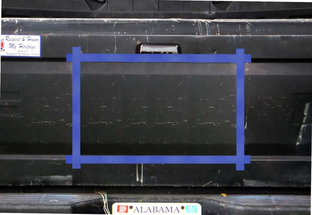 Tome hojas de periódico y cinta a cada hoja de la cinta que has sólo previstas, teniendo cuidado de no ir dentro del rectángulo (foto 2). Esto evitará que la pintura rociar demasiado sobre el trabajo de pintura del vehículo.