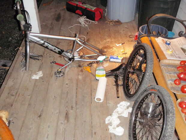 en primer lugar usted necesita tomar de cualquiera de las partes de la bici que usted no desea que pintado. y si no sacar algunas partes entonces te aconsejo que al menos cubra las piezas con toallas de papel o algo de ese tipo.