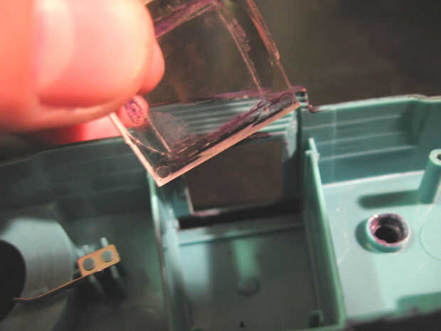 13. trate de deslizar la lente más grande fuera del fotograma. Esto fue un poco más difícil. Para esta tuve que empuje suavemente en él desde la parte superior de la carcasa para aflojarlo. ¿Recuerda donde estaba la Diana F + etiqueta engomada en la parte superior de la cámara? Hay un corte hay, he usado el destornillador muy ligeramente aplicar algo de presión a través de la lente. En efecto, intentó deslizar hacia fuera de este tiempo y estaba bien.