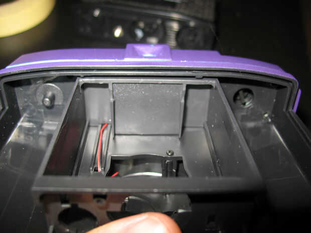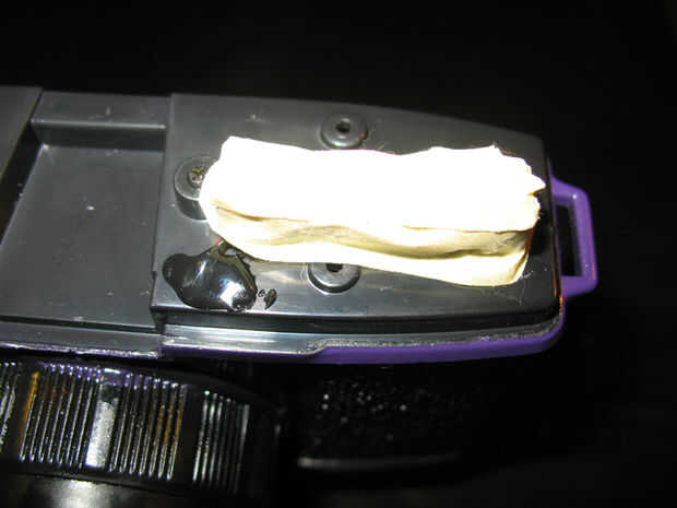 14. recoger el cuerpo de la cámara ahora. Verá algunos cables cajitas en la parte superior. Se trata de un flash. Usted puede simplemente cinta sobre éstos para conseguir pintado en. Probablemente no es una * gran * tratar incluso si lo hicieran, pero mejor seguro que lo siento. Usé cinta de enmascarar y acabo de ir alrededor y por encima de los cables y la carcasa.