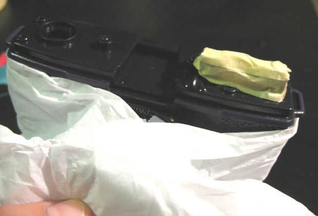 Para el contador, yo simplemente con cinta todo alrededor del mostrador conseguir papel de tejido alrededor de la parte "baches" de la espalda. Entonces me aseguré que cubrir la película rojo y el regulador al lado de los números del contador de película. Esto no consigue una capa de base; Sólo utilicé el spraypaint color como se ve en el siguiente paso.