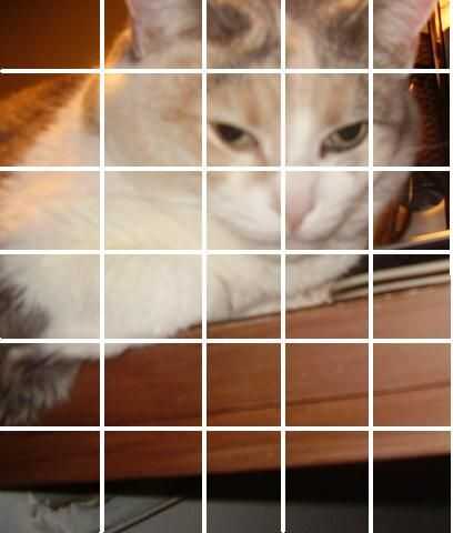 por ejemplo estoy usando una foto de mi gato. No hice la rejilla tan precisa como usted tendrá que hacer, pero usted consigue la idea. Esta rejilla es cinco unidades por seis unidades, por lo que transferiría muy bien a un piso que es de 5'x 6' o 10'x 12'. así que un cuadrado de una pulgada será igual a un pie cuadrado en el caso de lo 5'x 6' o será igual a dos pies cuadrados en la sala de 10'x 12'.