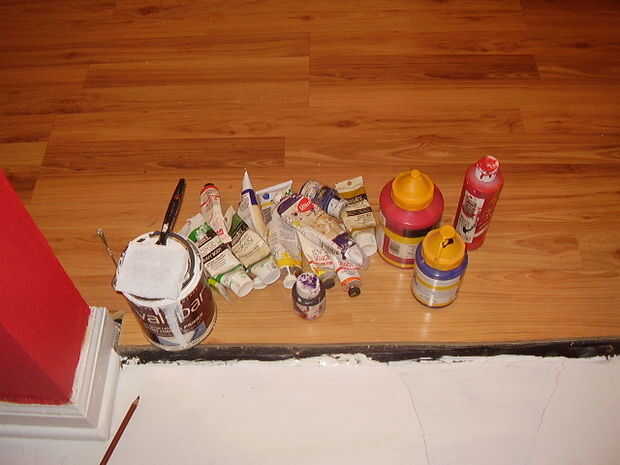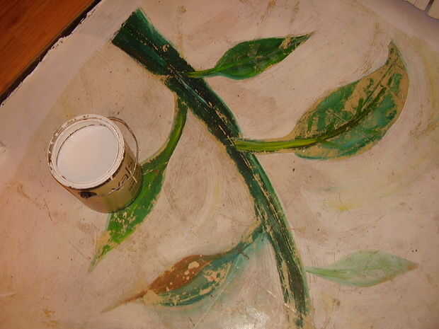 Tiendo a usar semi-gloss o brillo pintura látex de adorno porque es bastante durable. entonces para imágenes más suaves como el que hice para mi piso de la cocina que mezclé los acrílicos del artista con ella en mi plataforma. He utilizado un plato de papel como mi plataforma ya que tienden a trabajar bien para mí cuando estoy haciendo algo como esto en mi piso. no más respetuoso, pero sabía que rápido limpiar fue un factor para ésta. Tuve una idea un poco abstracción de flores de cerezo y haciendo en rojo para ir junto con la pared de acento de color rojo en el extremo de la habitación.