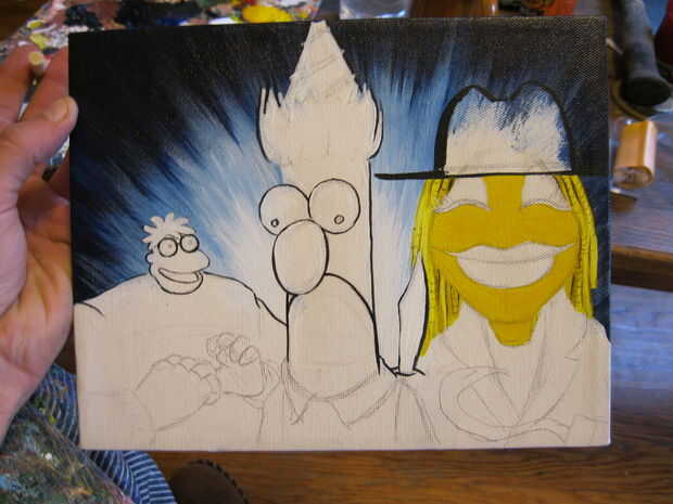 Una vez que se estableció el fondo, usé un cepillo de scriptliner para trazar las líneas de lápiz exterior que habían desaparecido bajo la pintura de fondo y blockout blanco para borrar las partes oscuras dentro de las líneas.