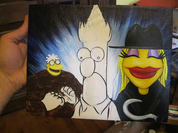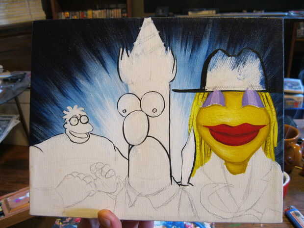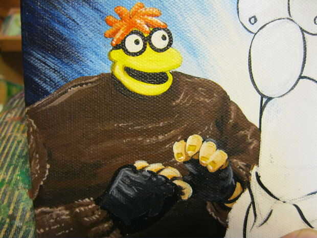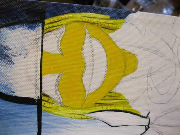 Cuando pinto algo como esto, por lo general utilizo un proceso de tres partes para cada área del color. Es el color base - en el caso de la cara de Janis, es un profundo color amarillo - con un toque de luz y un punto bajo. Primero pinto todas las áreas que requieran el color base, deje seque y luego volver a pintar tantas veces como sea necesario para hacerme sentir feliz con la riqueza del pigmento. Entonces añadir una poca de luz - que podría ser un tono más amarillo, o una sepia o un marrón. A menudo se experimenta con diferentes combinaciones hasta encontrar uno que me gusta (en este caso, creo que es una sienna) y comenzar a poner en las áreas más oscuras. El perímetro de la cara, la mandíbula donde se abre la boca de la marioneta, una sombra debajo de la barbilla, debajo de cada ojo y bajo el ala del sombrero de la hoja que lleva.