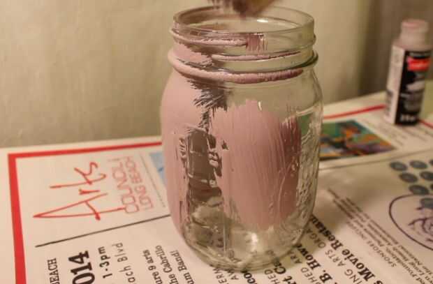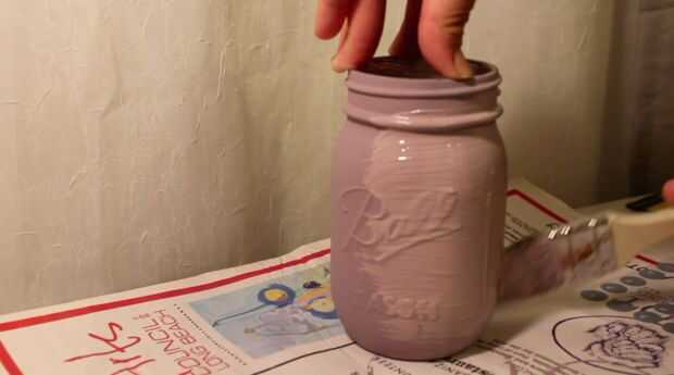 Pintar el exterior del tarro de masón y deje seco. Una vez que esté completamente seco, agrega la segunda capa de pintura y dejar secar.